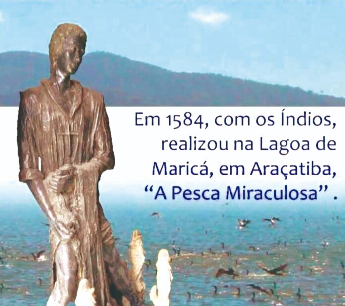 O Primeiro documento literário de Maricá R.J. foi a Pesca Miraculosa na Lagoa de Araçatiba 1984. Padre José de Anchieta, hoje São José de Anchieta, canonizado pelo Papa Francisco em 03/04/2014. “Celebrando a missa diariamente o Padre Anchieta anima os pescadores: “Jogai as vossas redes”! Os peixes abundantemente encheram às redes e os índios começaram a puxá-las. Os peixes pulavam enredados nas malhas. Às areis da lagoa iam ficando coalhadas de peixes. Anchieta acompanhava a euforia dos índios, rezando baixinho, agradecendo a Deus aquele milagre. Terminava a fome na aldeia. “Renova-se em nossa A Pesca miraculosa” 1584. Belchior Tavares que exercia o ofício de Tabelião na cidade do Rio de Janeiro registrou que Diogo Martins Mourão, casado com Francisca de Serrão doou, em 1627, uma légua de terras aos beneditinos em Maricá.